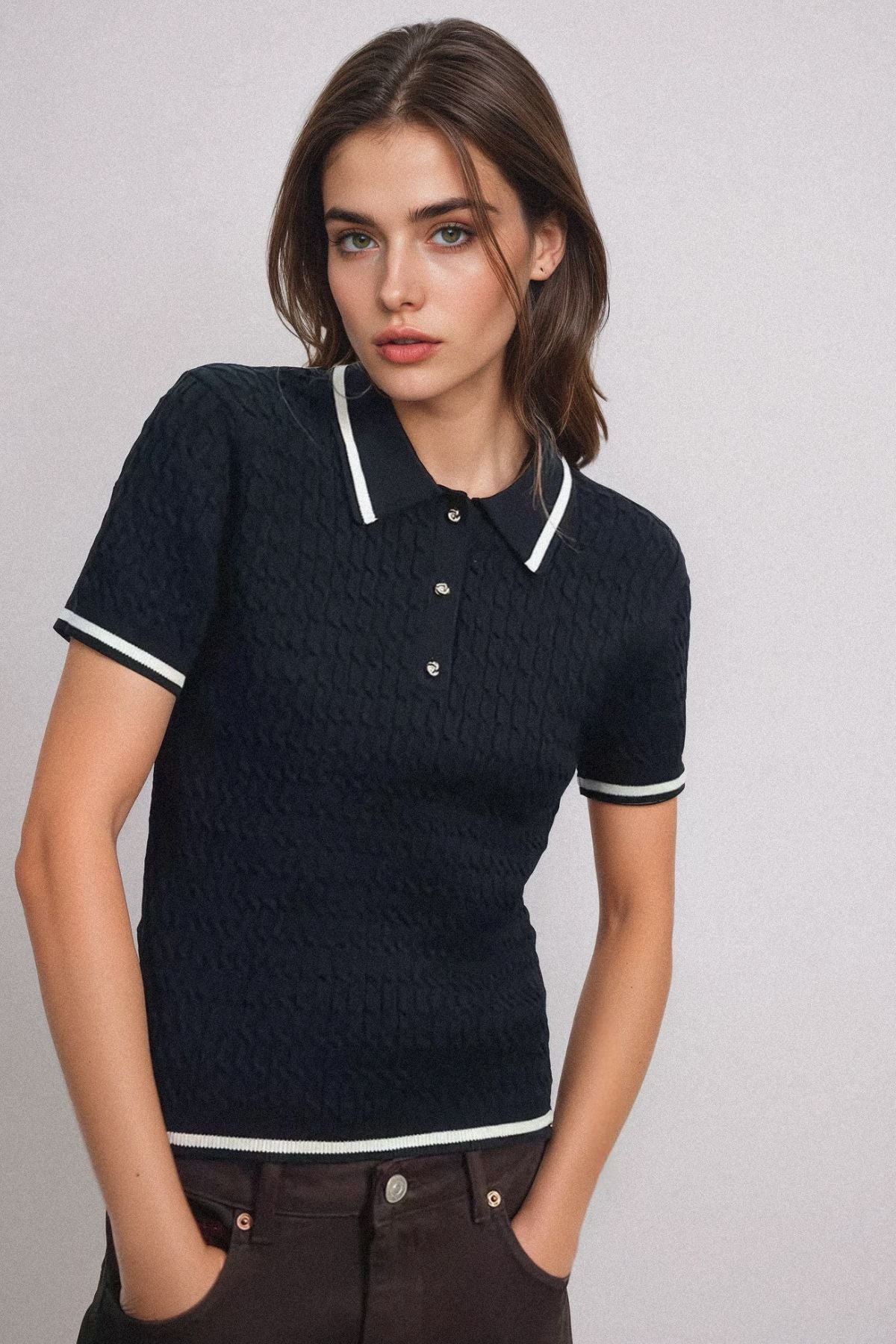 Design & Fit: Modern polo silhouette featuring a contrast-trimmed collar and sleeves, gold-toned knot buttons, and a fitted shape that skims the body without clinging.
