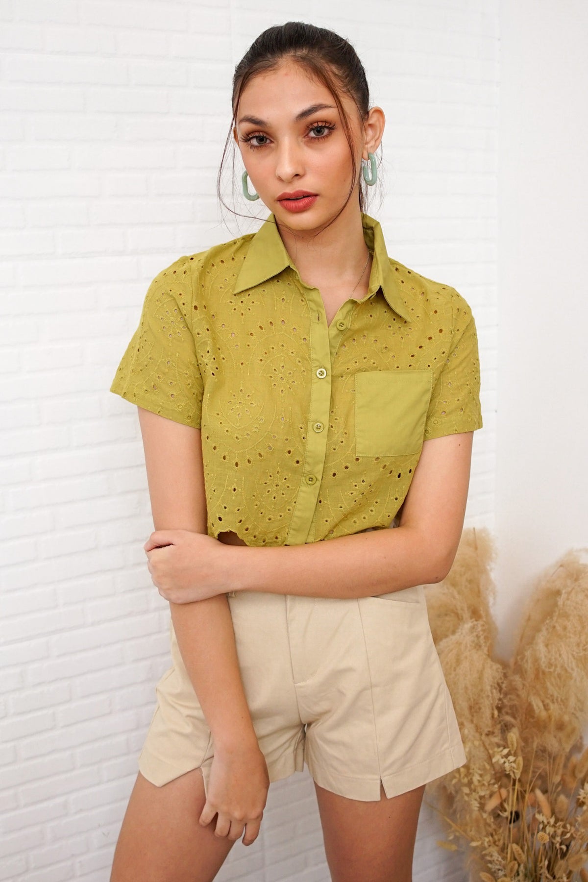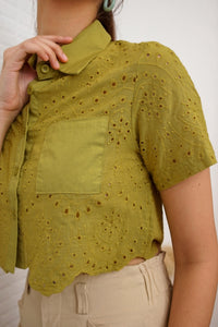 JANE Cropped Button-Down Eyelet Top (Apple Green)