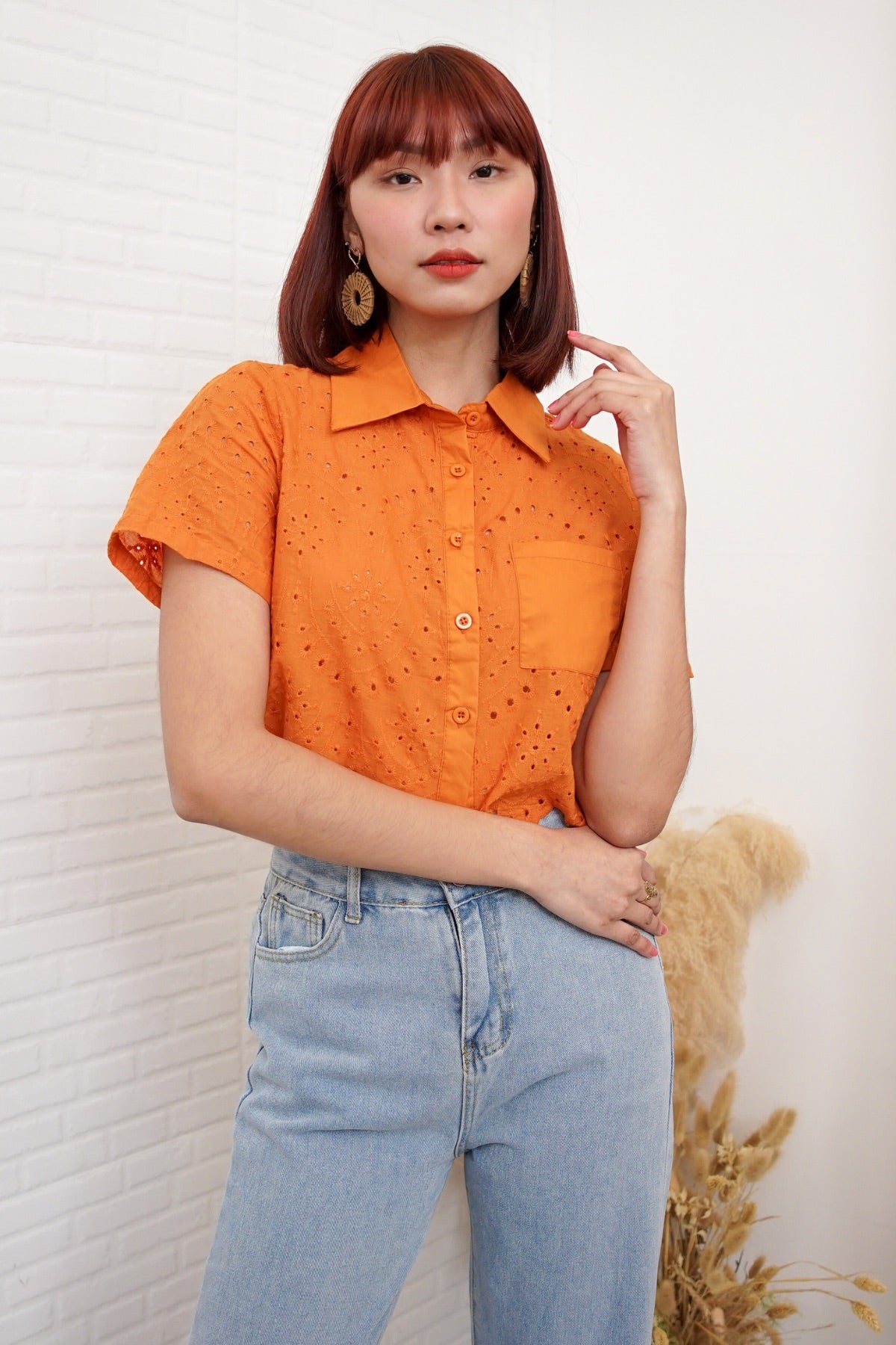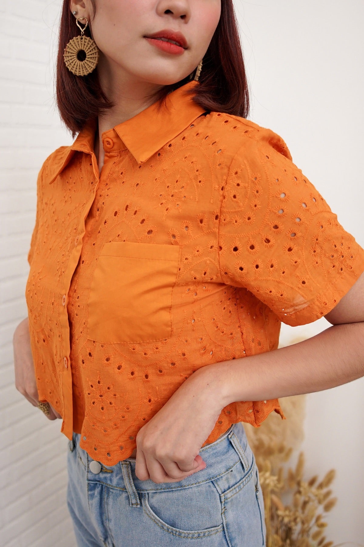 JANE Cropped Button-Down Eyelet Top (Tangerine Orange)