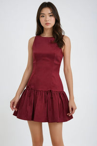 ARIA Boat Neck Bow Accent Ruffled Mini Dress (Burgundy Red)