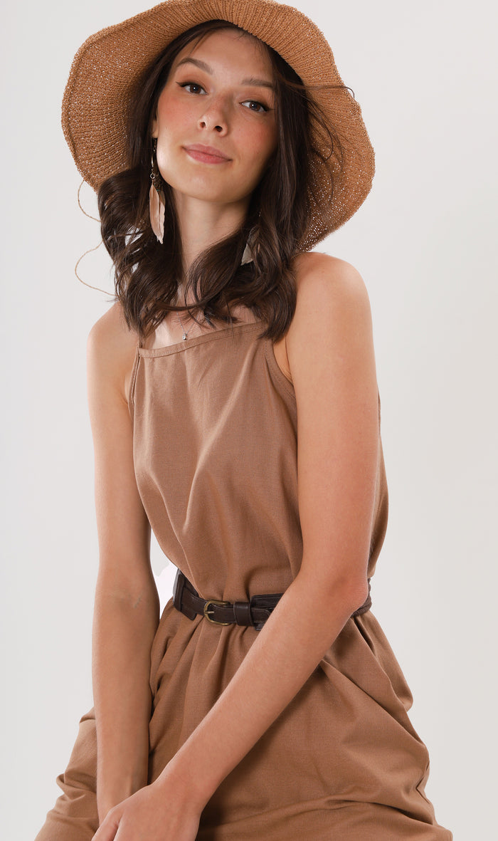 RAELYNN Halter Midi Parachute Dress W/ Toggle Drawstring Back & Hem (Stone Beige)