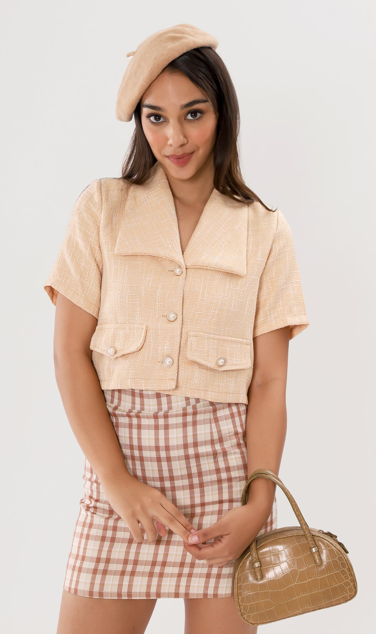 DIONNE Wide-Collar Tweed Blazer Top (Peach)
