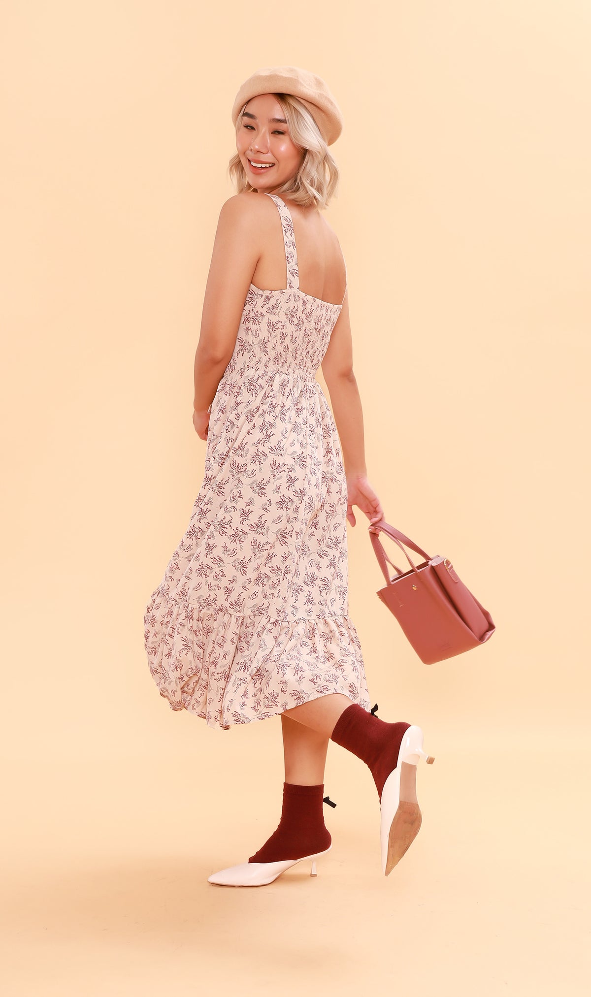 CRESSIDA Floral Lace-Up Midi Dress (Blush Beige)