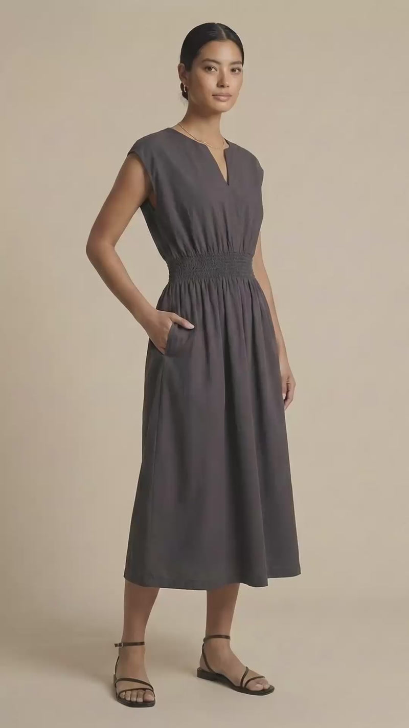 ELINE Smocked Waist Cotton Midi Dress with Pockets(Deep Gray)
