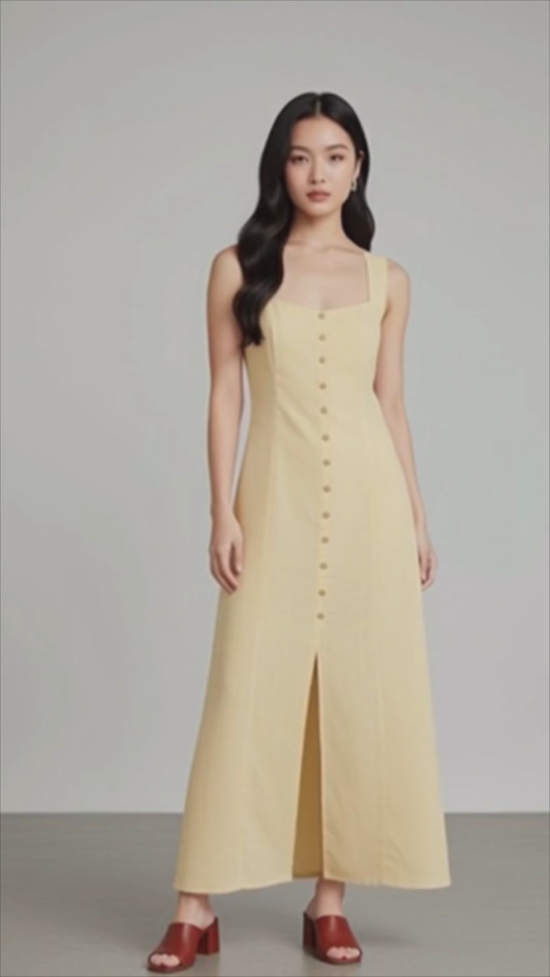 Design & Fit: A maxi dress with a clean square neckline and wide straps. Vertical panel seams create a structured, elongating fit through the bodice, complemented by a row of decorative buttons down the front. A subtle front slit adds movement, while a hidden back zipper ensures ease of wear.