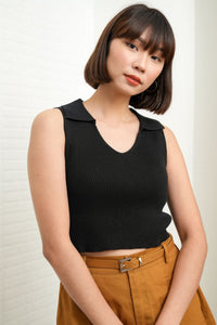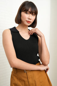GIGI Sleeveless Collared Rib-Knit Top (Black)