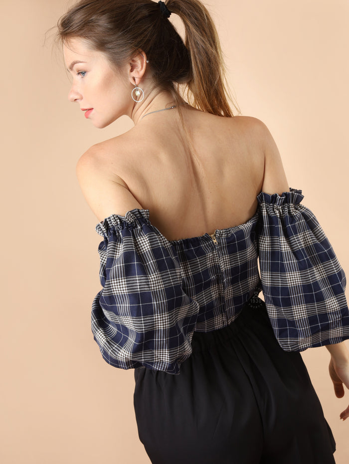 REESE Plaid Off-Shoulder Crop Top (Navy)